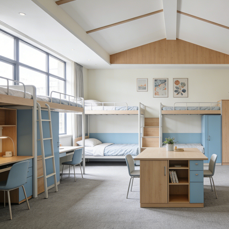 We use eco-friendly E1-grade panels and noise-dampening connectors in our Dormitory Bunk Bed construction. The specialized screw-free or silent-connection technology eliminates the squeaking common in metal Bunk Bed frames. This ensures a peaceful sleeping environment. Furthermore, the non-toxic powder coating on our Dormitory Bed systems is scratch-resistant and easy to sanitize, supporting a healthy and hygienic Dormitory Furniture experience.